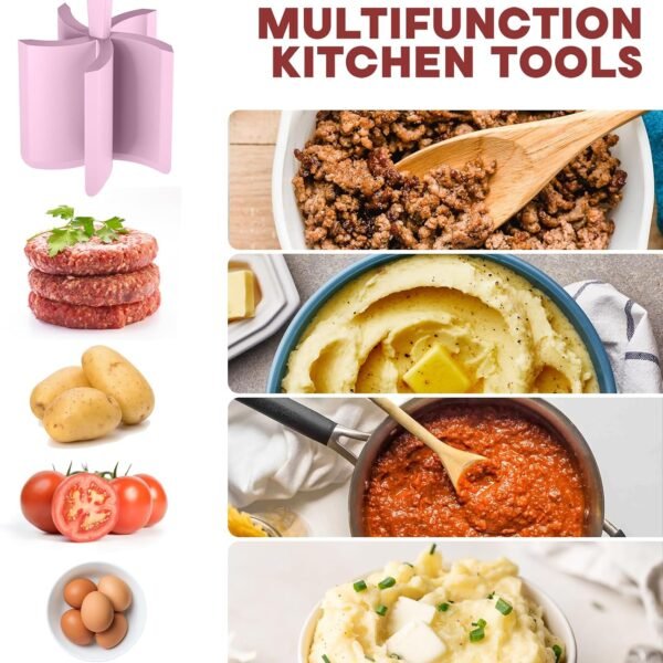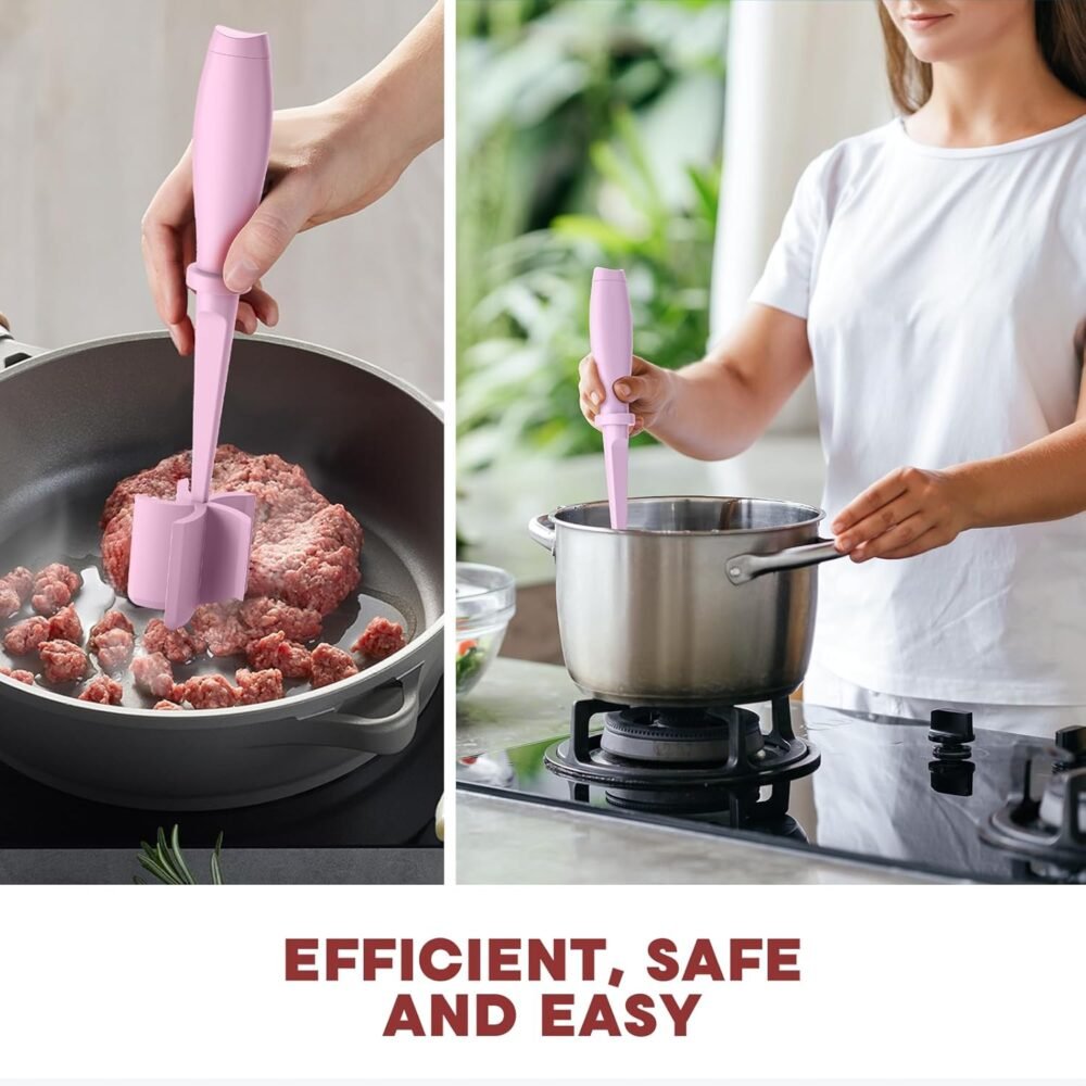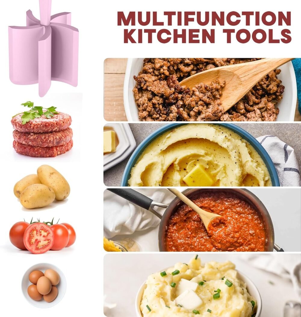 • Perfect Kitchen Tool: Our meat chopper tool with 5 wide beveled pinwheel blades, which is easier to chop and crumble food than other products with three or four blades. This meat masher can not only chop all kinds of meats for quick cooking, but is also very suitable for mixing and mashing other foods, such as gelatin, fruits, vegetables, etc.