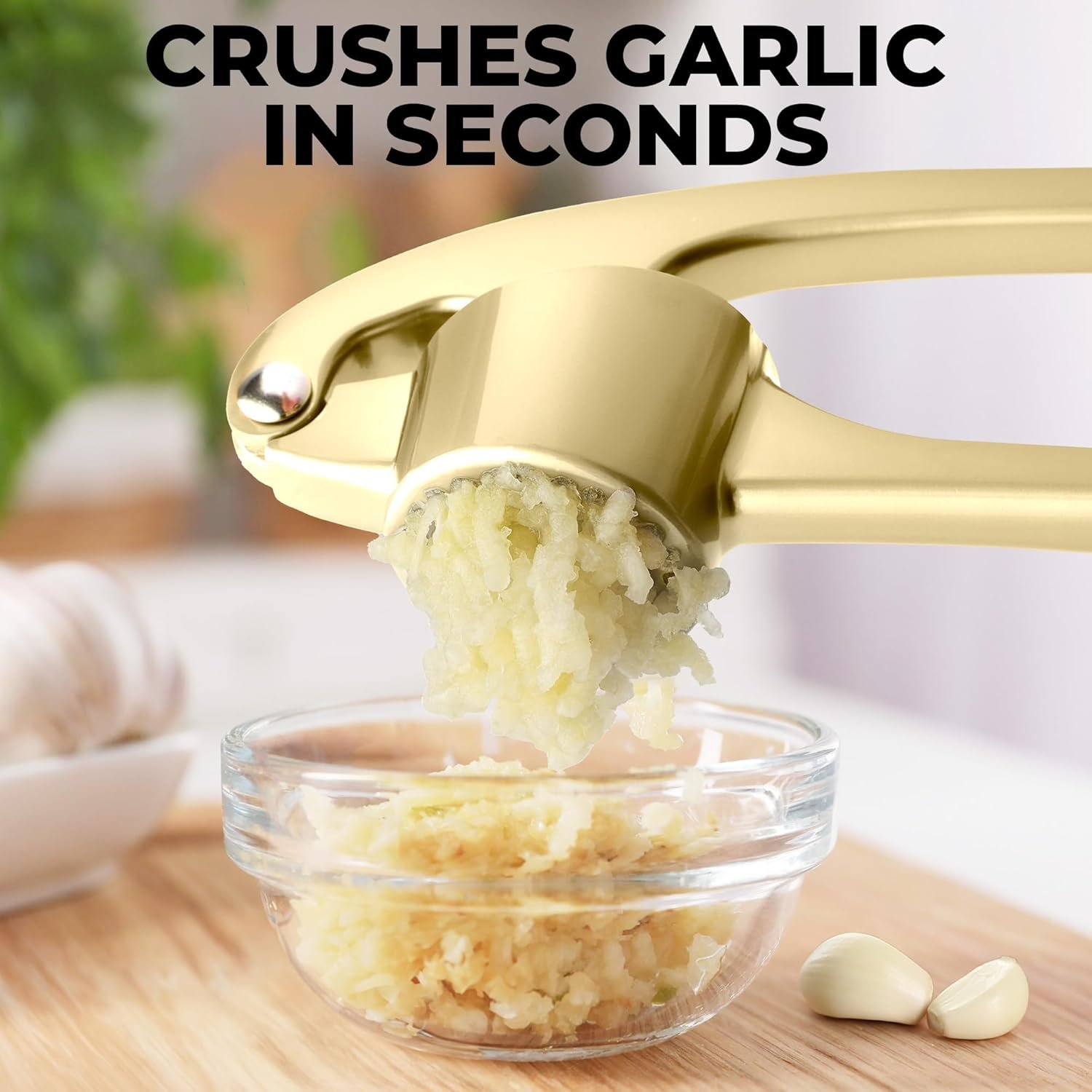 Premium Garlic Press Set – Rust Proof & Dishwasher Safe Professional Garlic Mincer Tool – Easy-Squeeze, Easy-Clean with Soft, Ergonomic Handle – Silicone Garlic Peeler & Brush (Silver)
