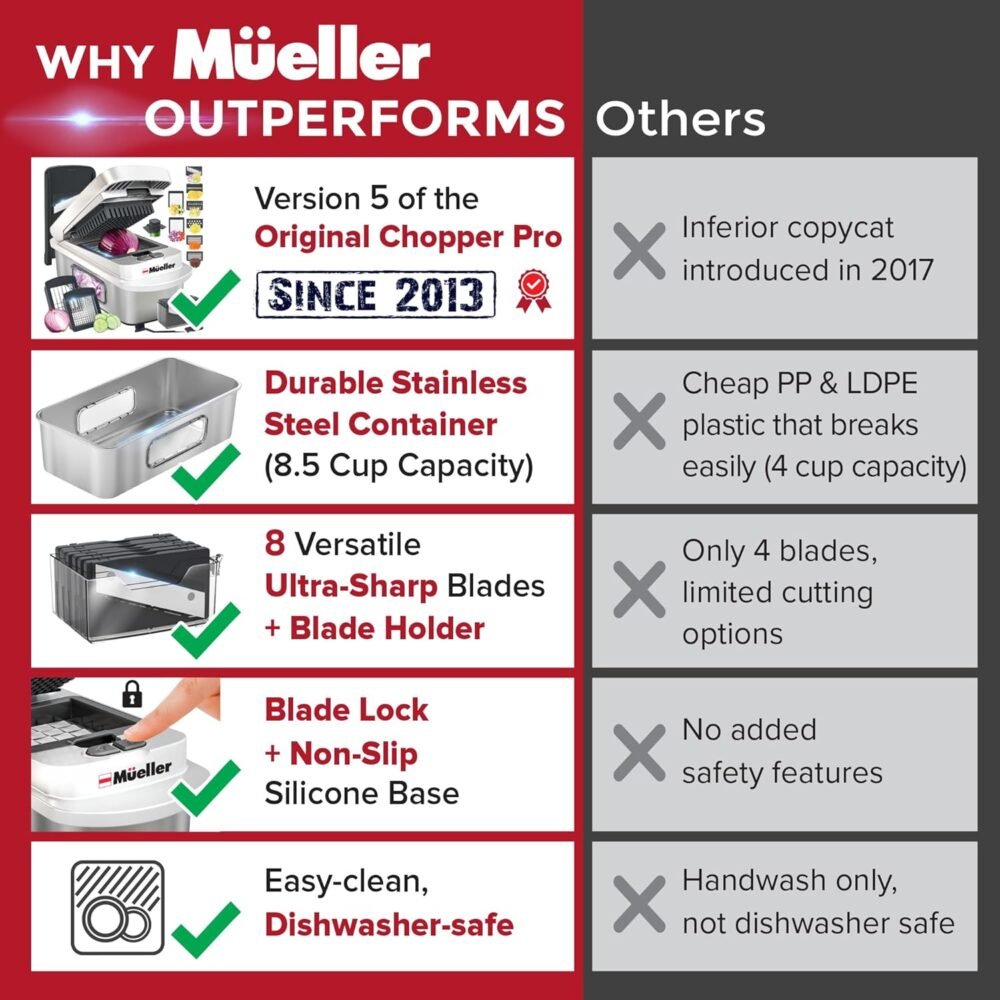 • The Original Pro Chopper Refined Since 2013 – Another well marketed lower quality white/black model claims to be the original. More restaurants use than all the others combined because of our quality.. Effortlessly chop, slice, and dice your ingredients with ease using our tough as nails chopper. It’s simple to use, set up, and clean, saving you time and energy during meal preparation. Become a kitchen pro with this must-have kitchen tool.